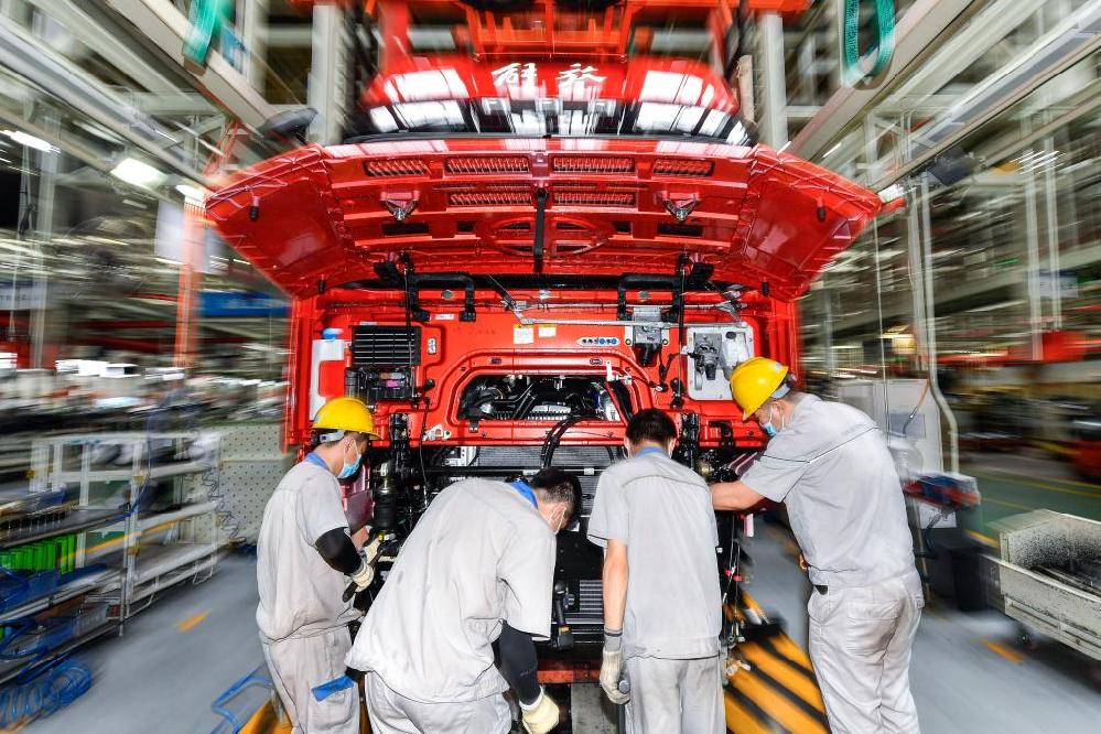 2022年6月15日,工人在位于吉林长春的一汽解放总装车间内装配车辆。新华社记者 许畅 摄