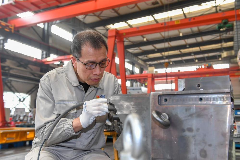 4月25日,在位于吉林长春的一汽铸造有限公司铸造模具设备厂,钳工李凯军打磨模具零件。新华社记者 张楠 摄