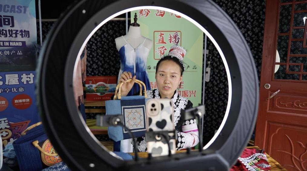 午饭过后,如往常一般,杨文丽换上一身苗绣装扮,来到车间旁的文创产品直播间,准时上线直播,并热情地用普通话、贵州话和苗语向网友推介苗绣产品。不一会儿,直播间内就涌入不少观众,开始询问她关于苗绣防晒帽、苗绣斜挎包的问题。