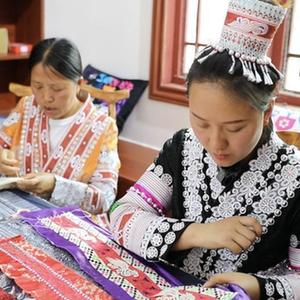 太阳初升,走进贵州省毕节市黔西市新仁苗族乡化屋村的易地扶贫搬迁安置点,苗绣产业制作车间一片繁忙景象。村里的“95后”苗族绣娘杨文丽,一早便开始了忙碌的一天,和村里其他绣娘们坐在一起,赶制一批线上苗绣文创产品订单。
