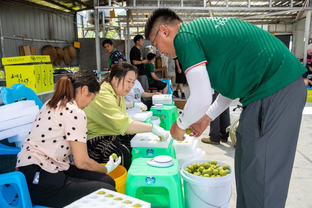 7月6日,在重庆市巫山县巫峡镇文峰村的巫山脆李种植园外,工作人员在选果。新华社记者储加音 摄