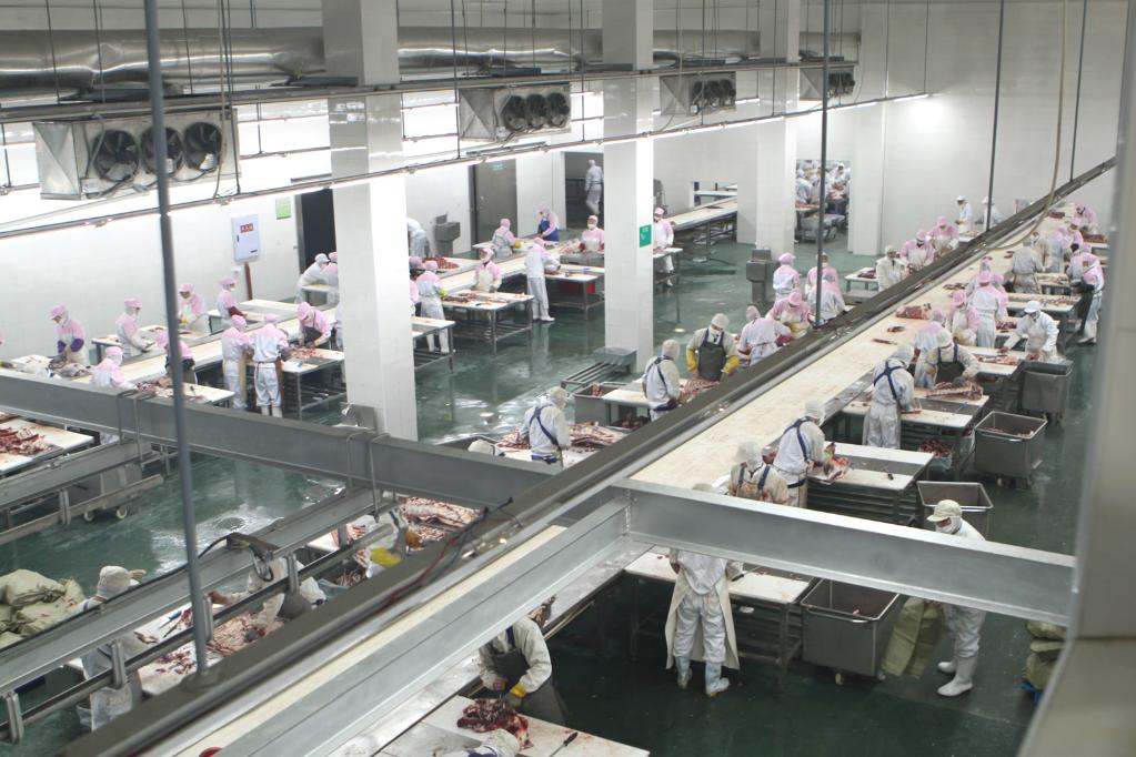 重庆恒都农业集团有限公司精深加工车间,工人们正在分割牛肉。(严周 摄)
