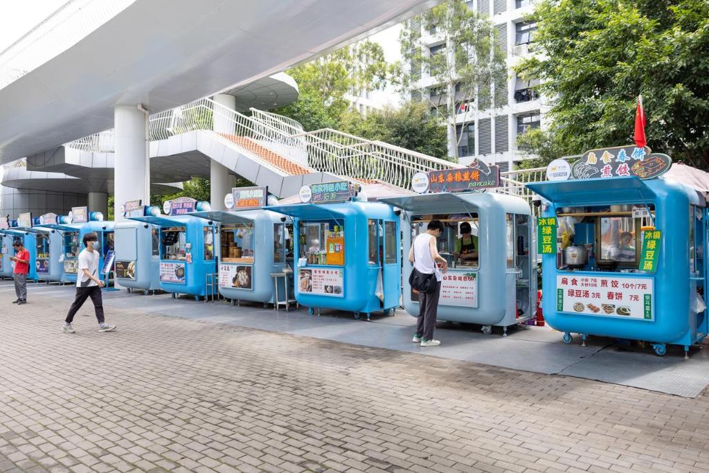 类似这样的“摊规点”还有很多。在厦门市湖里区BRT县后站点附近,一排统一涂装的小餐车形成一道靓丽风景线。每天清晨5点,20多位摊主就陆续“上工”。