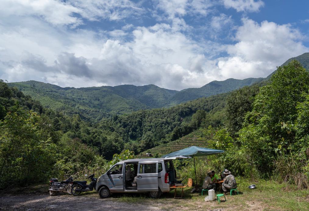 7月20日,在云南省普洱市江城县,亚洲象监测员们在临时搭建的炉灶旁吃饭。