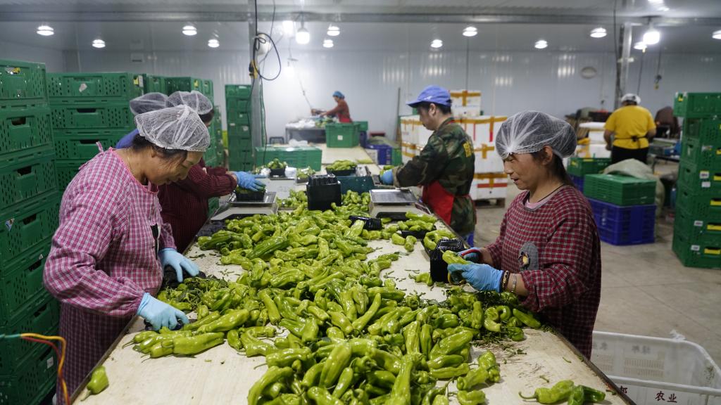 时值正午,屋外烈日当空,屋内一片凉爽。在恒温26摄氏度的分拣厂房中,工人们正修剪、挑选、打包,一盒盒包装精致的青椒、土豆等被送进物流箱,等待发货。