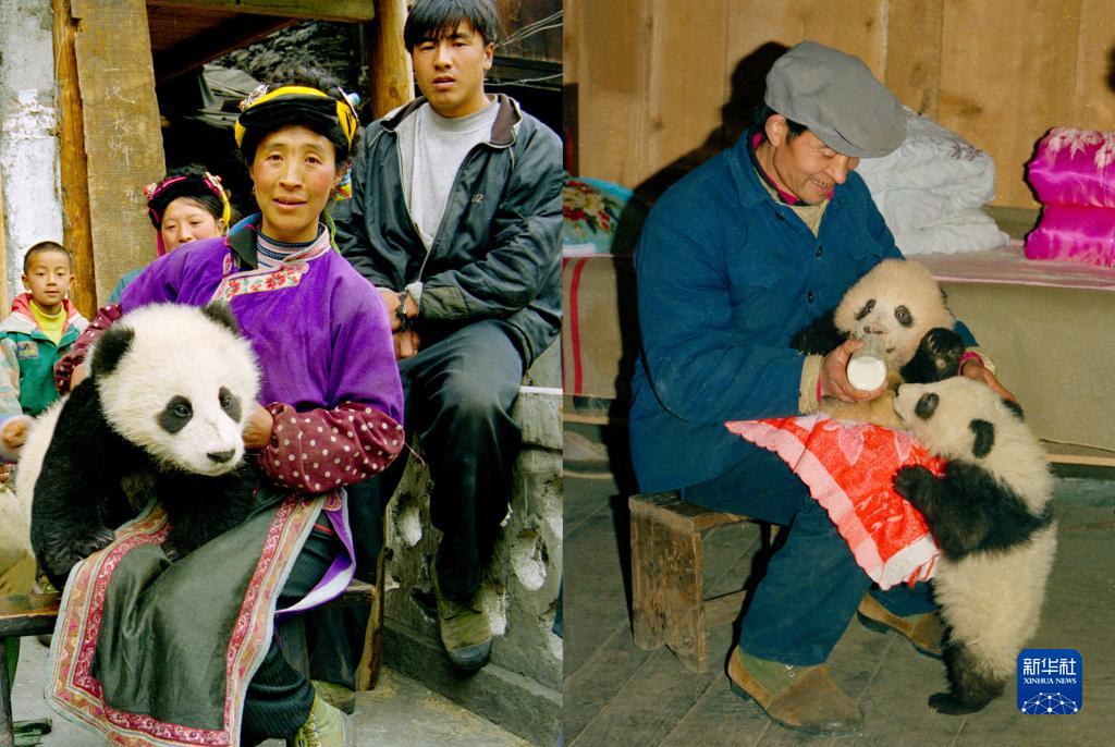 宝兴县村民与大熊猫和谐共处(资料照片,摄于20世纪)。新华社发(宝兴县委宣传部供图)