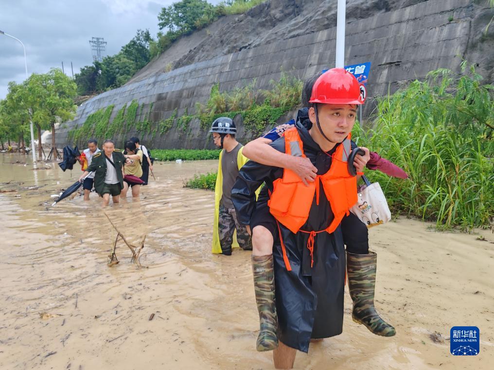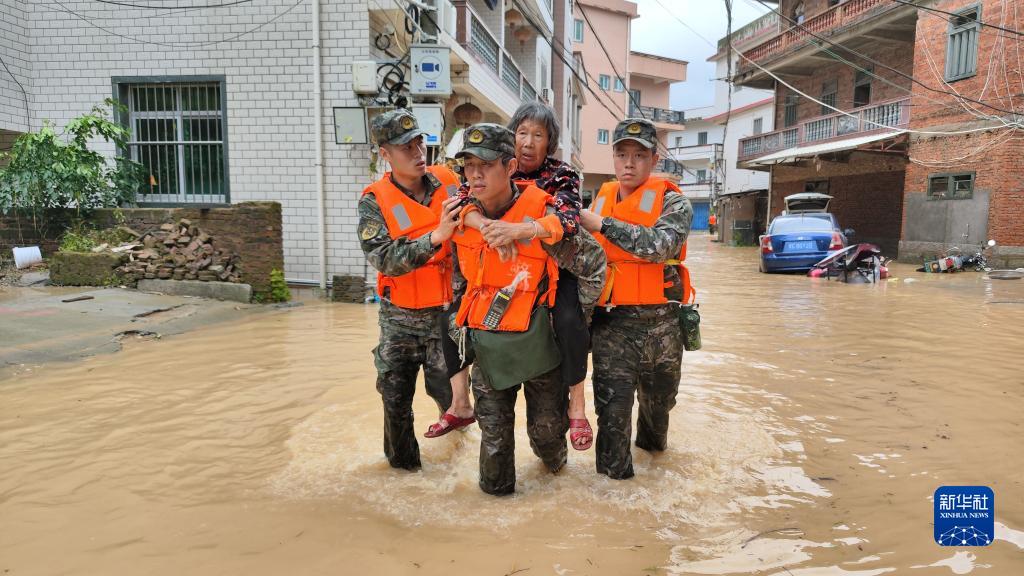 7月29日,福建省晋江市人武部组织民兵深入内坑镇受灾地区转移受困群众。新华社发(庄靖怡 摄)