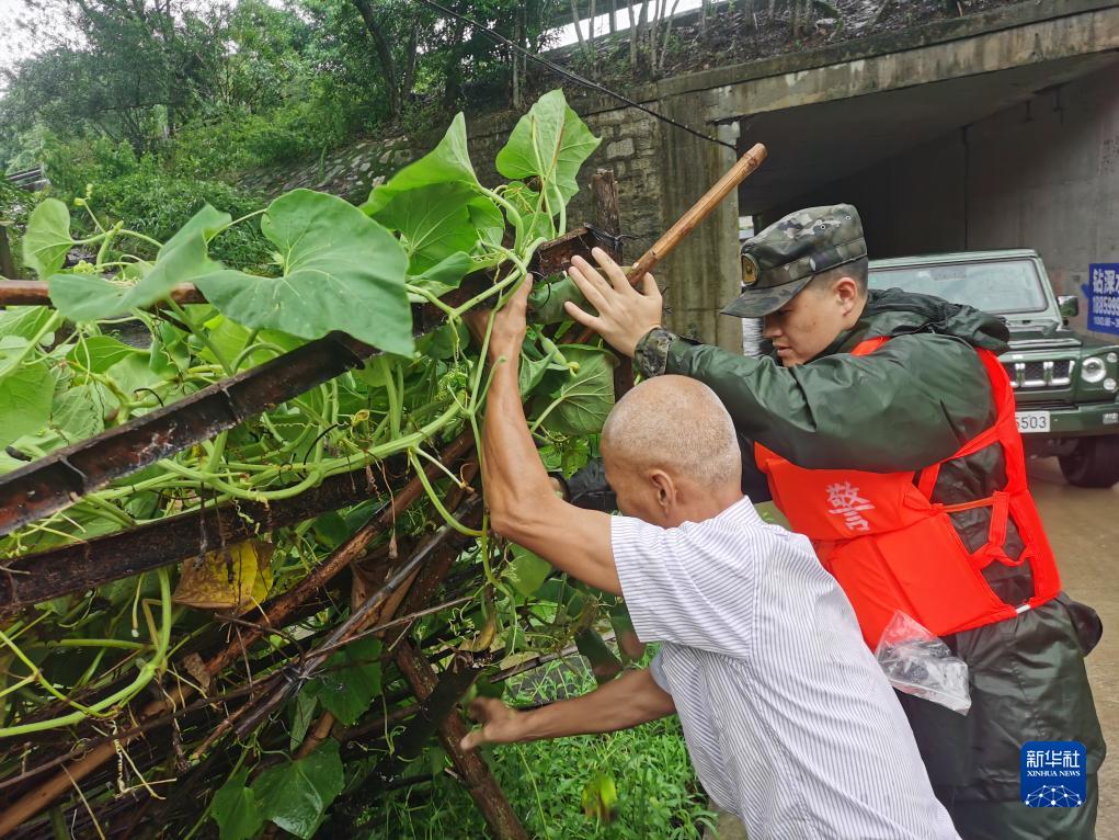 7月29日,武警福建总队机动支队官兵在福州市连江县潘渡镇帮助受灾老人清理菜园。新华社发(黄祖万 摄)