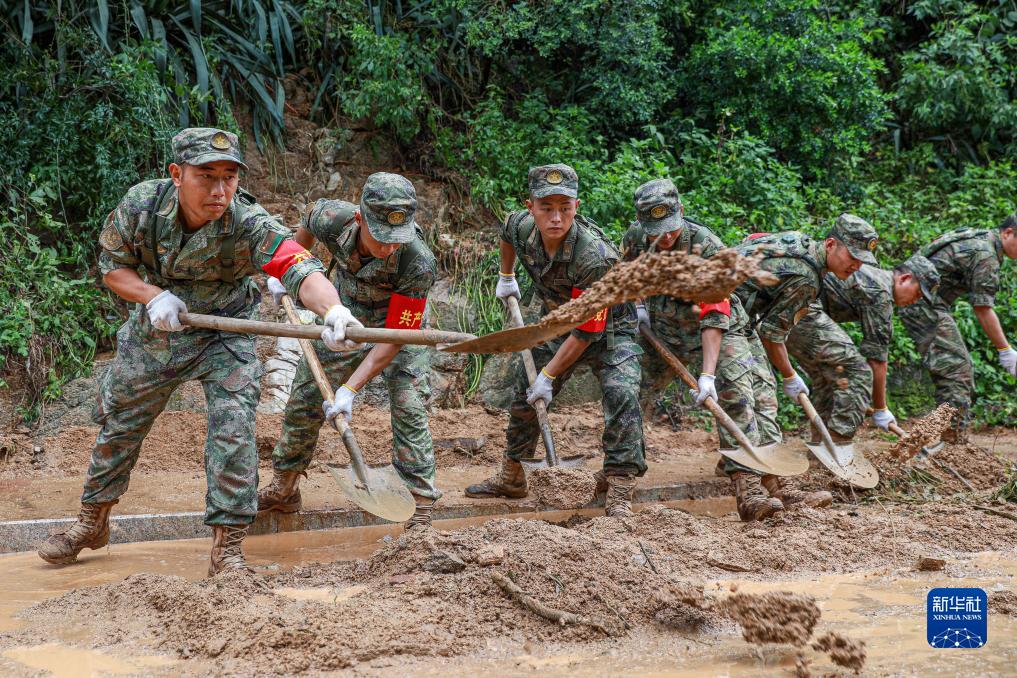 7月29日,陆军第73集团军某旅党员突击队在惠安县螺城镇梅山村附近乡道紧急处置山体滑坡,清理淤泥。新华社发(李嘉宁 摄)