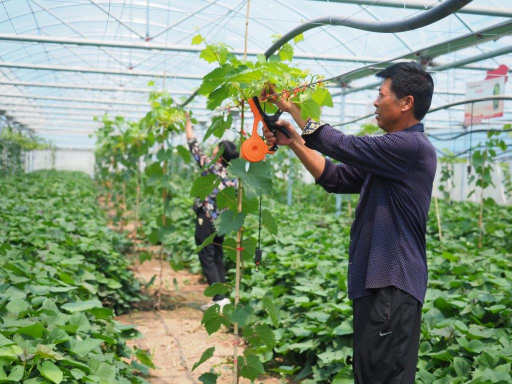 新华社济南7月30日电(记者高天)“上面种的是葡萄,下面栽的是红薯,一个大棚两份收益。”在山东省滨州市博兴县庞家镇的葡萄种植园,几名正在修剪秧苗的村民告诉记者,“这么新鲜的种植方法,以前大家想都不敢想!”