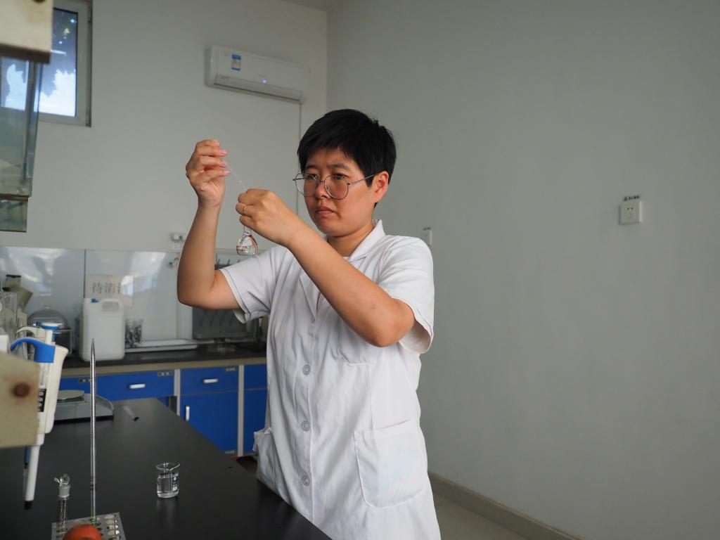 在山东滨州智源生物科技有限公司的研发办公室,工作人员正在进行化验操作。新华社记者 高天 摄