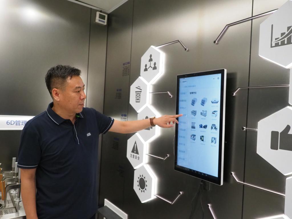 山东京都厨业有限公司总经理赵盼江正在演示智慧厨具操作系统。新华社记者 高天 摄