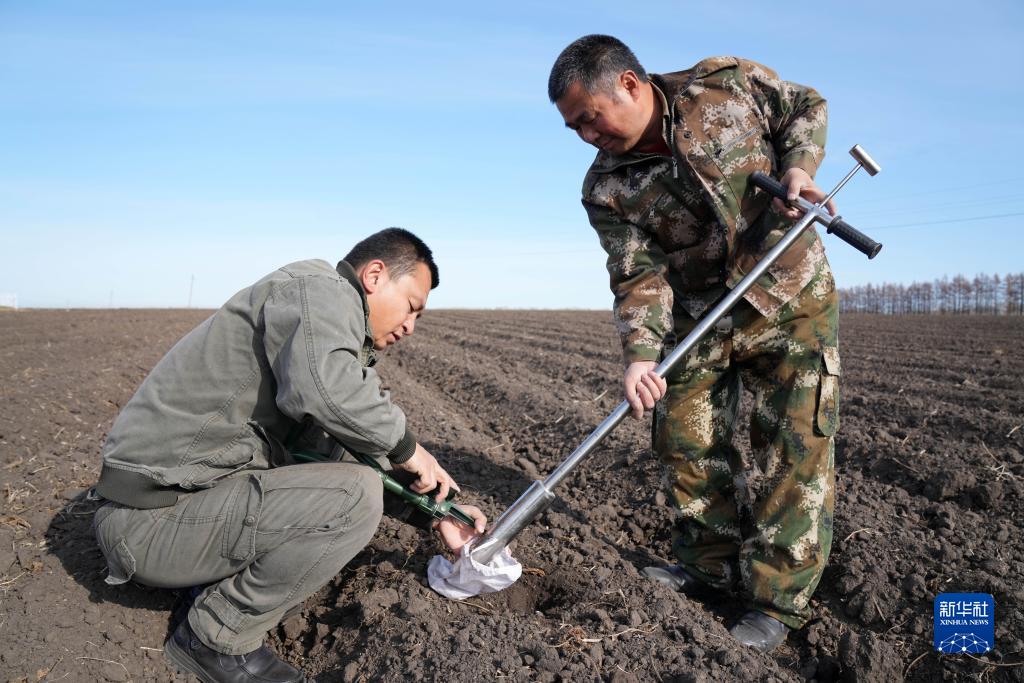 北大荒集团北安分公司赵光农场有限公司技术人员在取土样,为测土配方施肥做准备(2022年10月20日摄)。新华社记者 王建威 摄