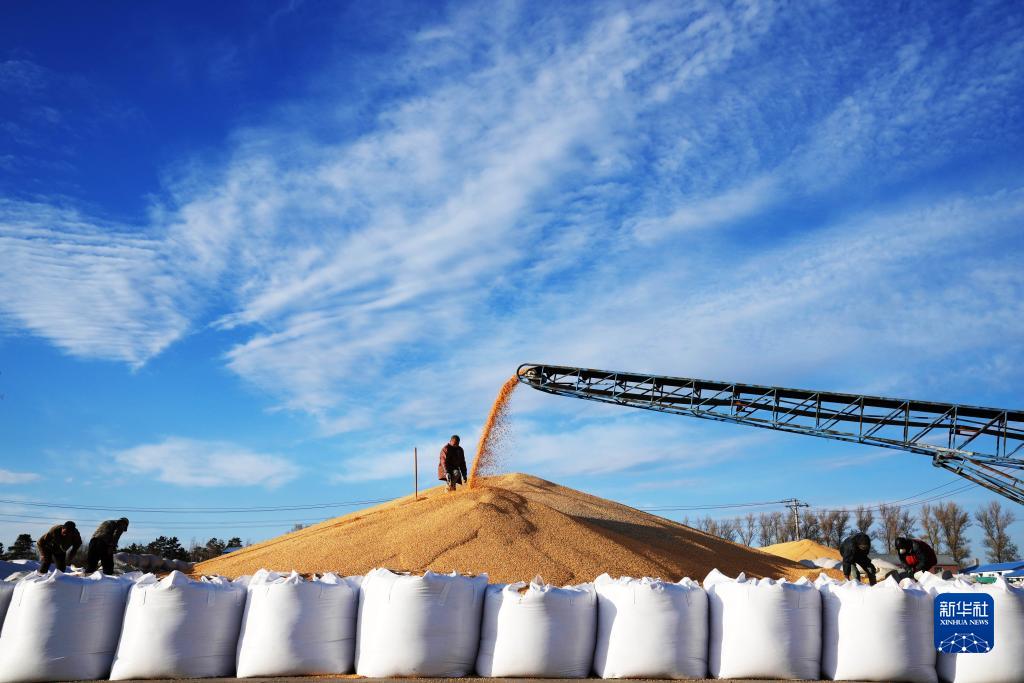 在北大荒集团北安分公司赵光农场有限公司,工作人员在一处晒场的玉米堆上忙碌(2022年10月19日摄)。新华社记者 王建威 摄