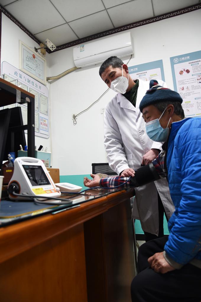 临沭县一位乡村医生正在给村民测量血压。新华社记者李志浩 摄