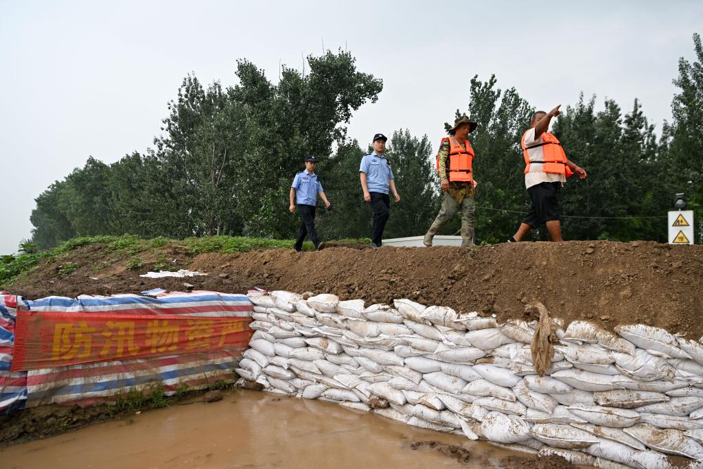 8月1日,在天津市武清区黄花店镇邵七堤村,公安人员和村志愿者联合在河堤加高处巡查值守。新华社记者孙凡越 摄