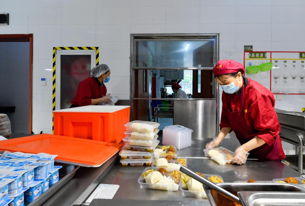 8月1日,在天津市武清区职业教育中心临时安置点,工作人员为转移人员准备午饭。新华社记者孙凡越 摄