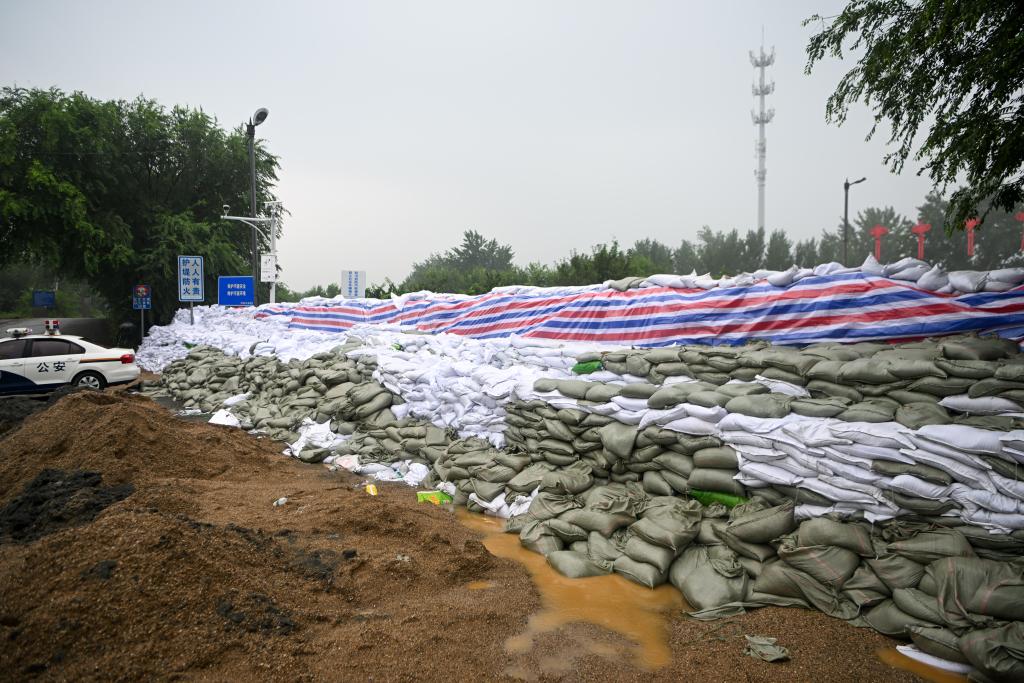 8月1日,在天津市北辰区双街镇庞嘴村村口,施工人员用沙袋构筑起一条人工堤坝。新华社记者孙凡越 摄