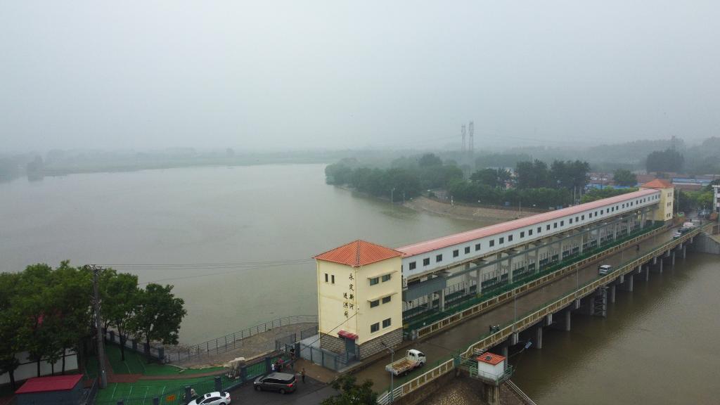 这是8月1日在海河流域永定河下游拍摄的永定新河进洪闸现场(无人机照片)。新华社记者孙凡越 摄