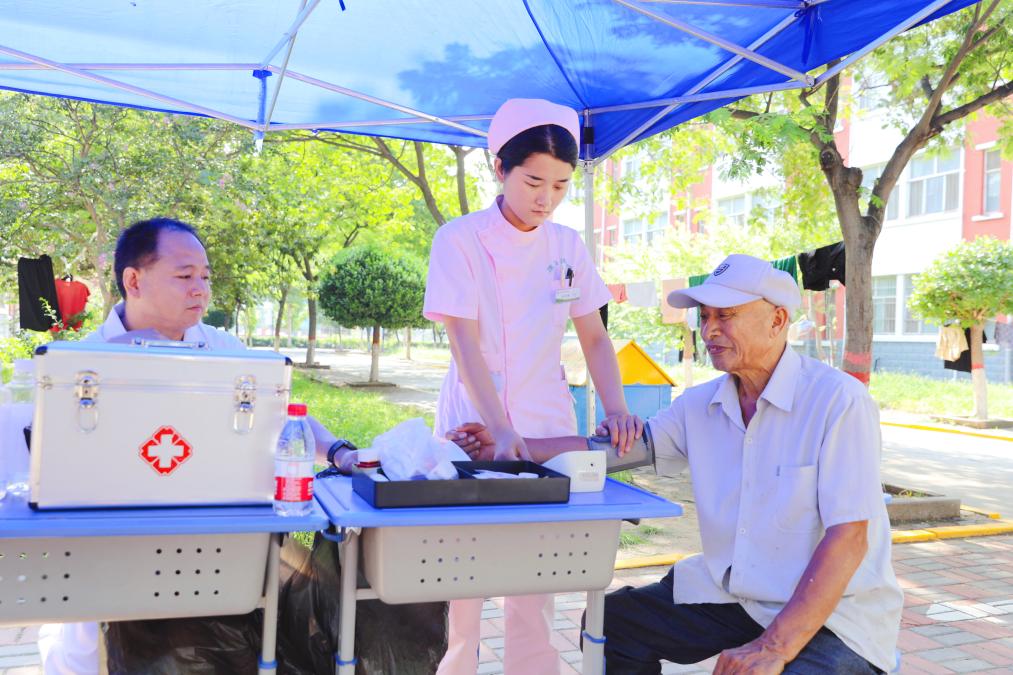 河北省宁晋县一安置点的医护人员在为转移群众量血压。(新华社记者岳文婷摄)