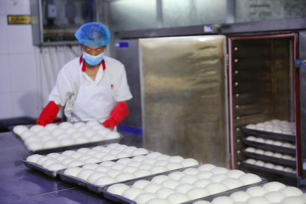 河北省宁晋县一安置点的食堂工作人员在为转移群众准备主食。(新华社记者赵鸿宇摄)