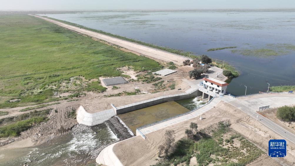 这是8月2日拍摄的塔里木河干流下游的大西海子水库输水闸口(无人机照片)。新华社发(王傲 摄)