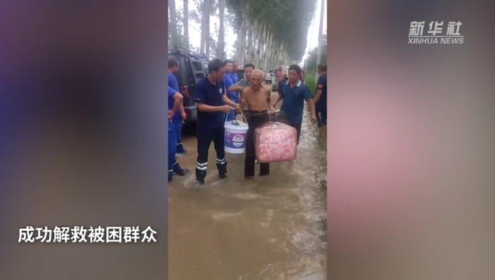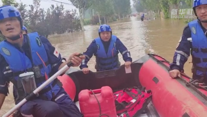 到达涿州后,在当地应急管理局的带领下,救援队在高官庄镇开展救援,乘坐汽艇,深入受灾区,解救受困群众。