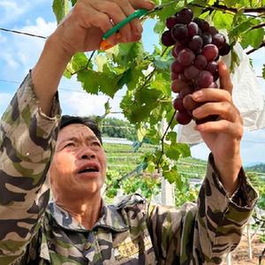 在湖南省冷水江市铎山镇眉山村,67岁的谢桂民顶着烈日穿梭在葡萄种植基地,他一边摘下紫里透红的葡萄,一边笑呵呵地盘算着今年的收成:“150亩葡萄,少说也能有200多万元收入。”
