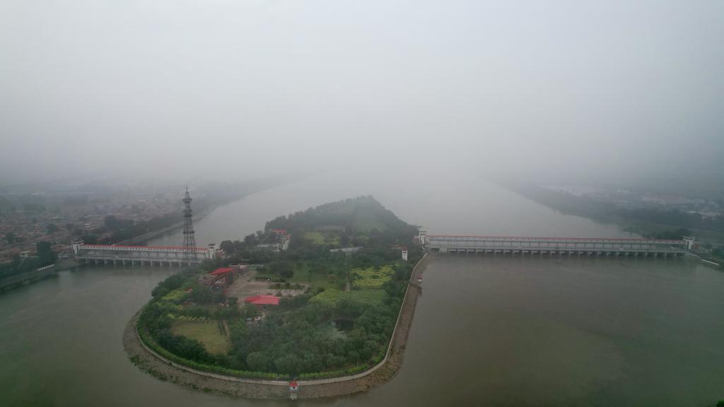 新盖房水利枢纽分洪闸和溢流堰(无人机照片)。新华社记者 刘诗平 摄