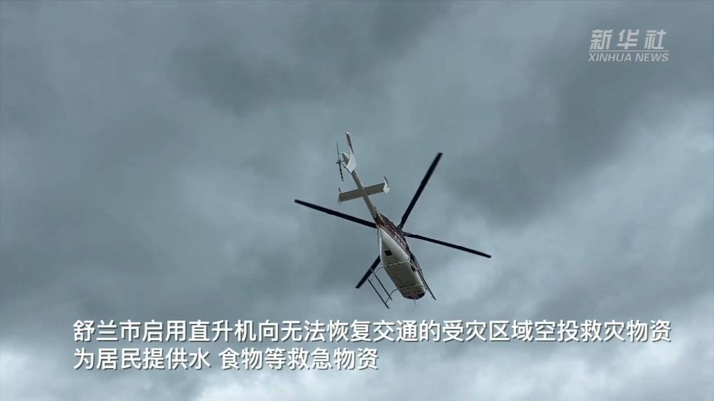 受连续强降雨影响,吉林省舒兰市部分村庄和道路受到洪水侵袭。舒兰市启用直升机向无法恢复交通的受灾区域空投救灾物资,为居民提供水、食物等救急物资。