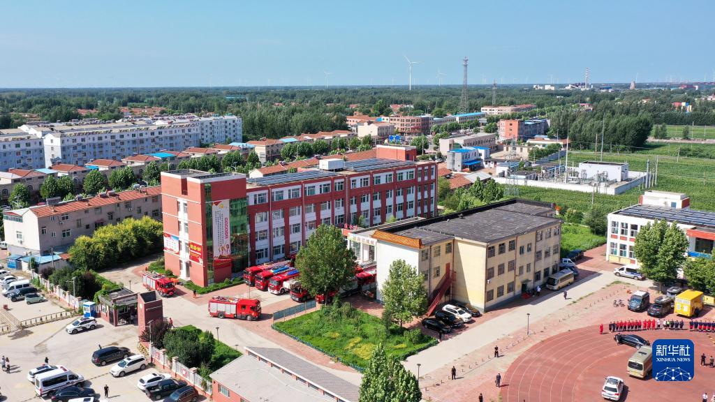 8月6日,在平原县王打卦中心小学,应急救援队伍集结待命(无人机照片)。新华社记者 郭绪雷 摄
