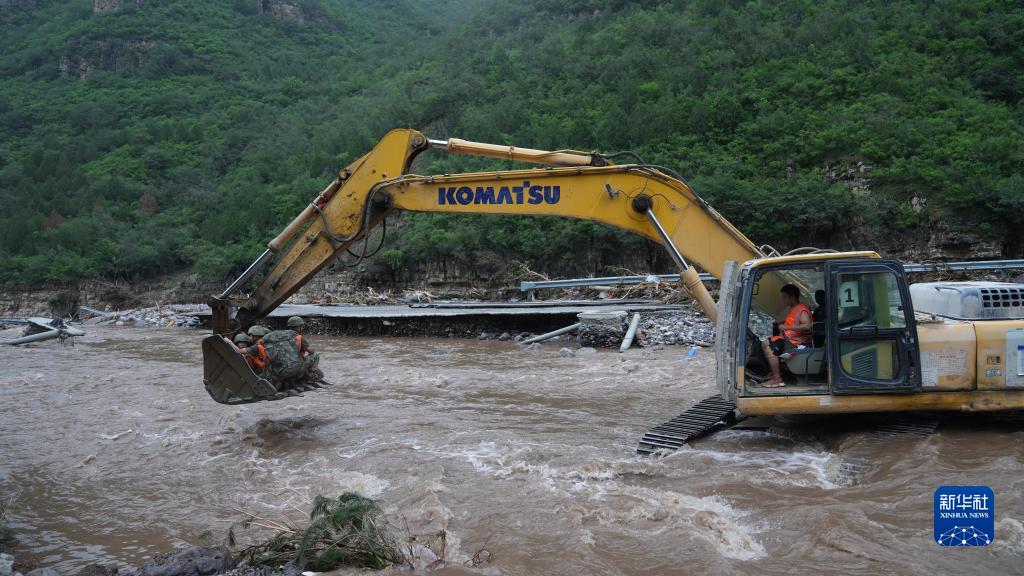 中部战区陆军第82集团军某工兵旅官兵在北京市昌平区流村镇帮助被困群众转移(8月2日摄)。新华社发(郭磊磊 摄)