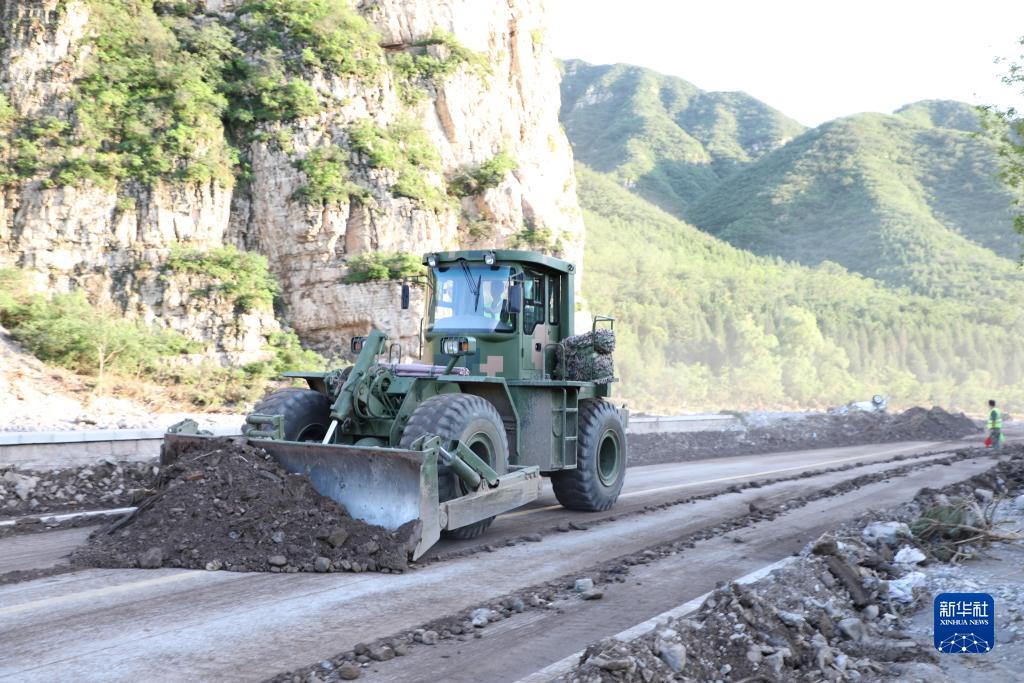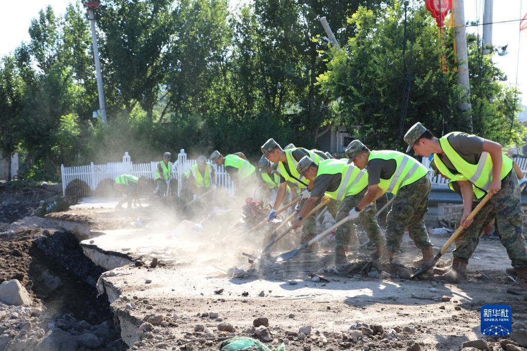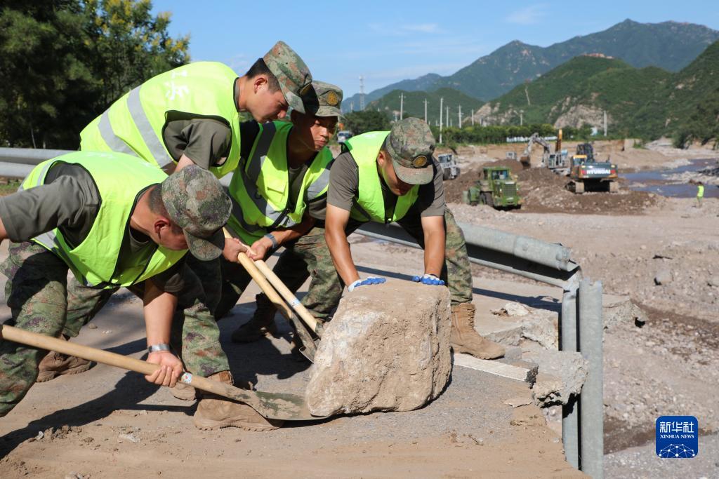 中部战区陆军第82集团军某工兵旅官兵在北京市昌平区流村镇清理道路(8月5日摄)。新华社记者 李晓明 摄