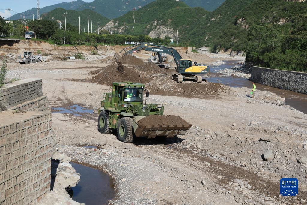 中部战区陆军第82集团军某工兵旅在北京市昌平区流村镇使用工程机械开挖河道(8月5日摄)。新华社记者 李秉宣 摄