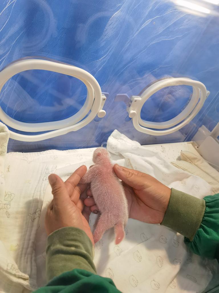 大熊猫宝宝出生以来,一直由“莽仔”在产房哺育,工作人员在前期进行了适当人工辅助。目前,“莽仔”奶水充足,宝宝体重增长较快,现体重已达1439克。