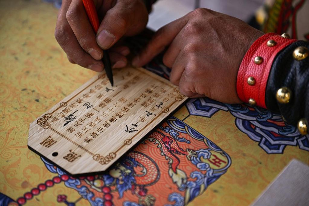 李森在为游客手写“关照”(7月14日摄)。新华每日电讯记者陈钟昊 摄