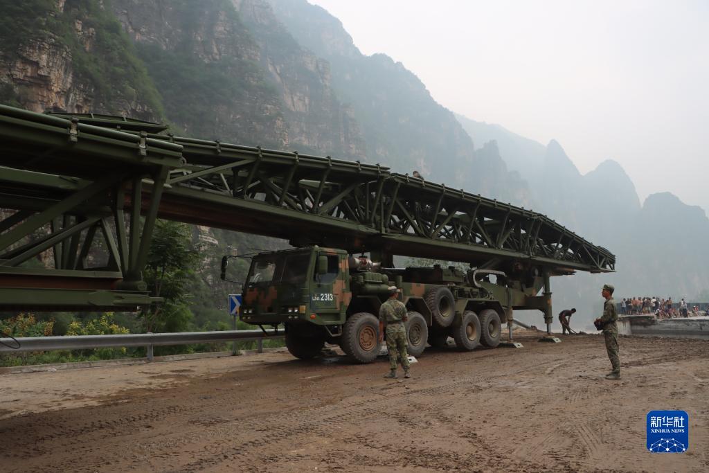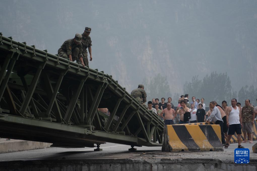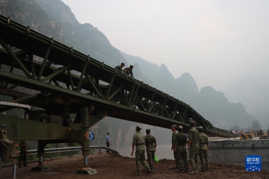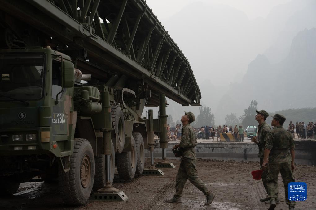 8月3日,中部战区陆军第82集团军某旅官兵在北京市房山区涞宝路四渡桥断桥处架设桥梁。新华社发(张康 摄)