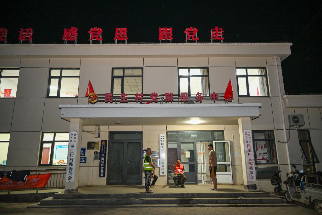 8月7日晚,村干部及留守人员在天津市静海区台头镇民生村村委会门外交谈。新华社记者 孙凡越 摄
