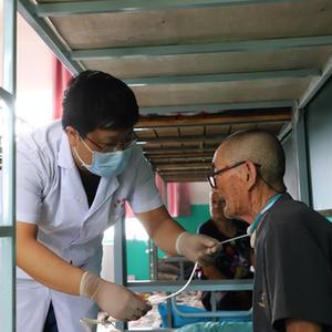 在廊坊市文安县苏桥镇临时集中安置点,医生正在为一名转移安置群众进行术后护理。(受访者供图)
