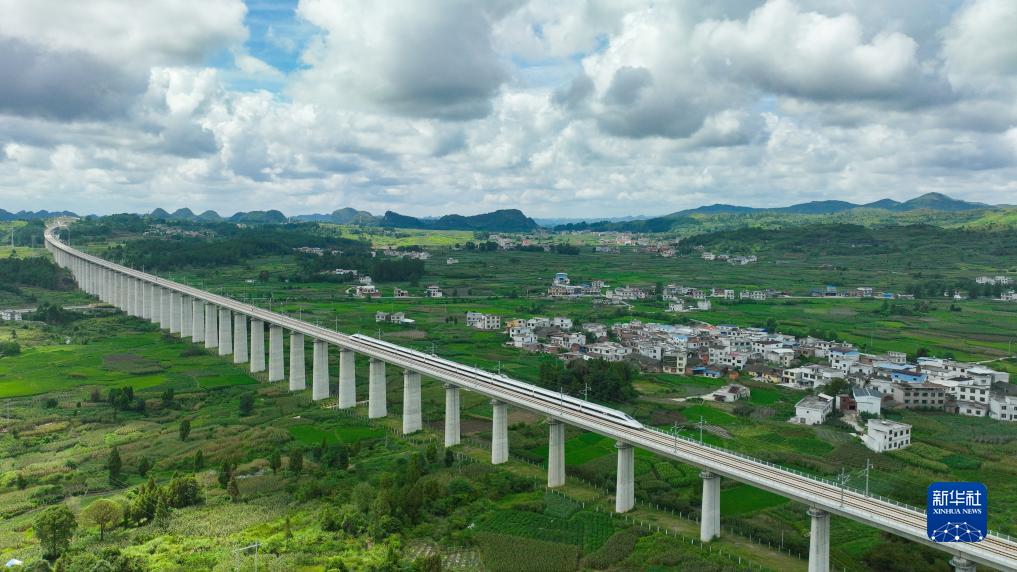 试验动车组经过位于贵州省独山县的贵南高铁拉里双线特大桥(8月2日摄)