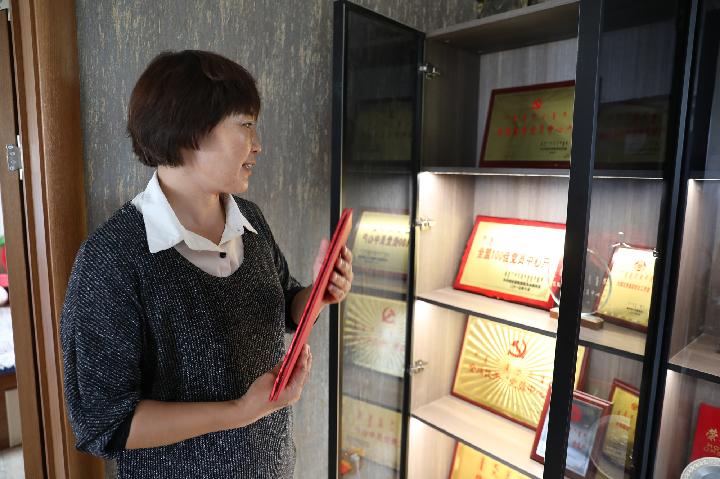 客厅一角的玻璃柜前,人们停下脚步。只见柜中整齐地摆满金色奖状、红色证书和各类奖杯,上面写着致富带头人、“美丽庭院”示范户、优秀党员中心户和巾帼文明志愿者等。