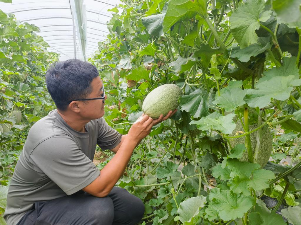 夏秋时节是甜瓜丰收的季节。走进位于山东省济南市章丘区高官寨街道的山东会园农业科技有限公司的甜瓜大棚,只见一排排藤蔓上挂着一个个成熟的网纹瓜,阵阵瓜香扑鼻而来。