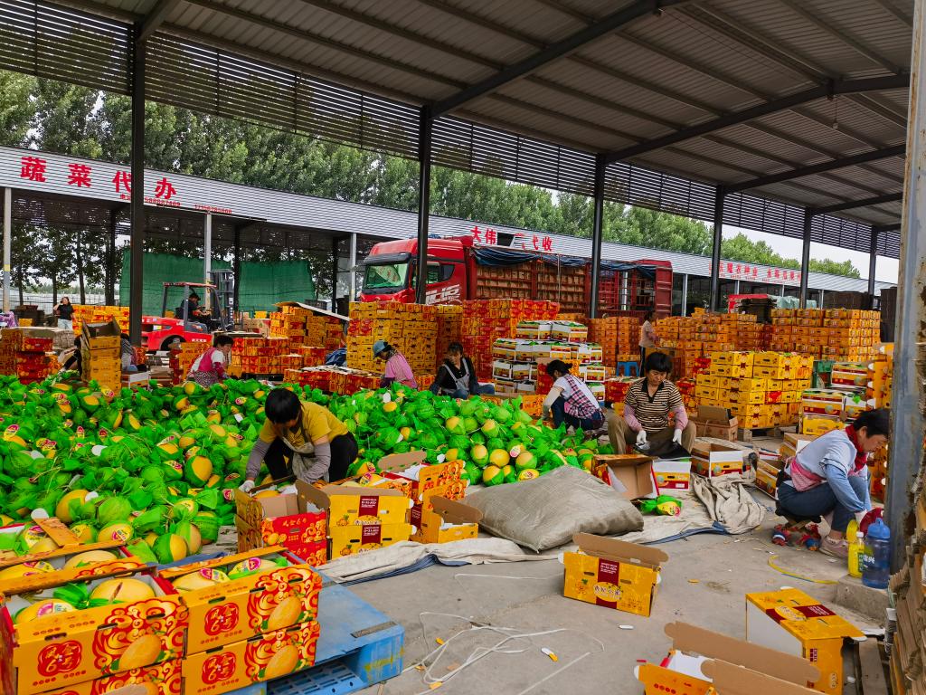 在官庄甜瓜市场,村民们正忙着将甜瓜进行分选、装箱。新华社记者王志 摄