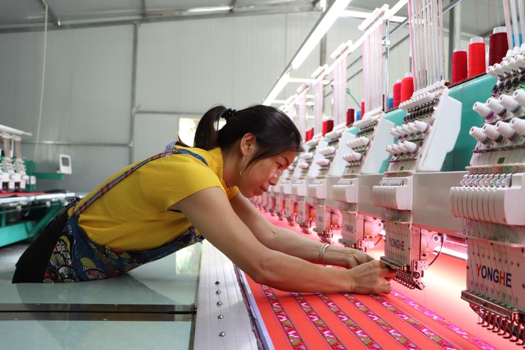 在距离腊肉加工厂约500米处的苗绣加工厂内,村民杨四妹和工友们也在忙碌着,一张张绣片在他们手中被缝制成漂亮的苗族服饰。