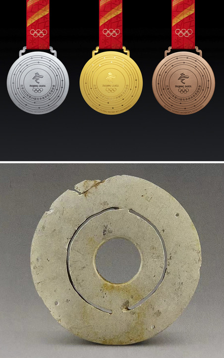 拼版照片:上图为北京冬奥会奖牌(背面)(北京冬奥组委供图);下图为凌家滩遗址出土的双连璧(凌家滩遗址管理处供图)。新华社发
