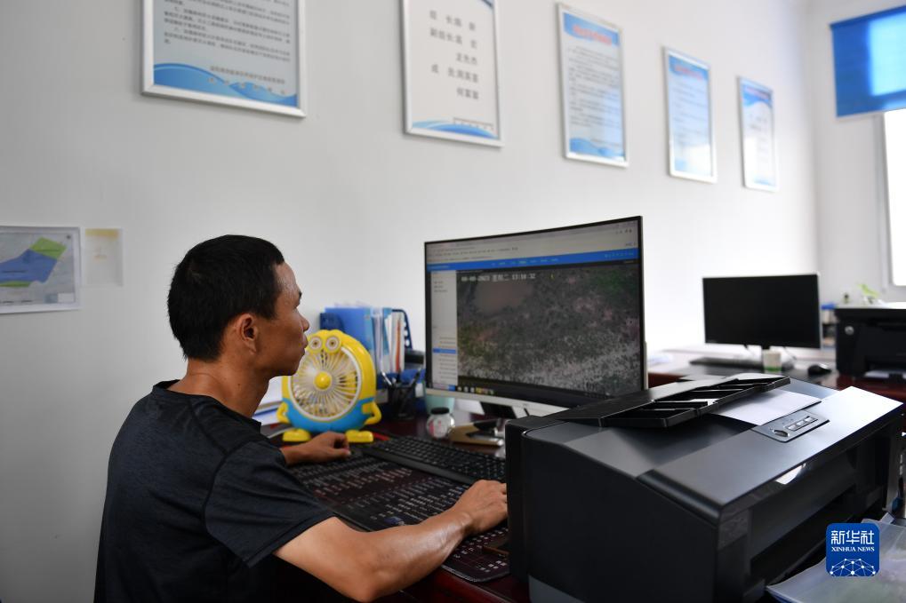 8月8日,陈新在湖南南洞庭湖自然保护区南县管理局舵杆洲保护管理站通过电脑查看实时监测画面。新华社记者 陈振海 摄