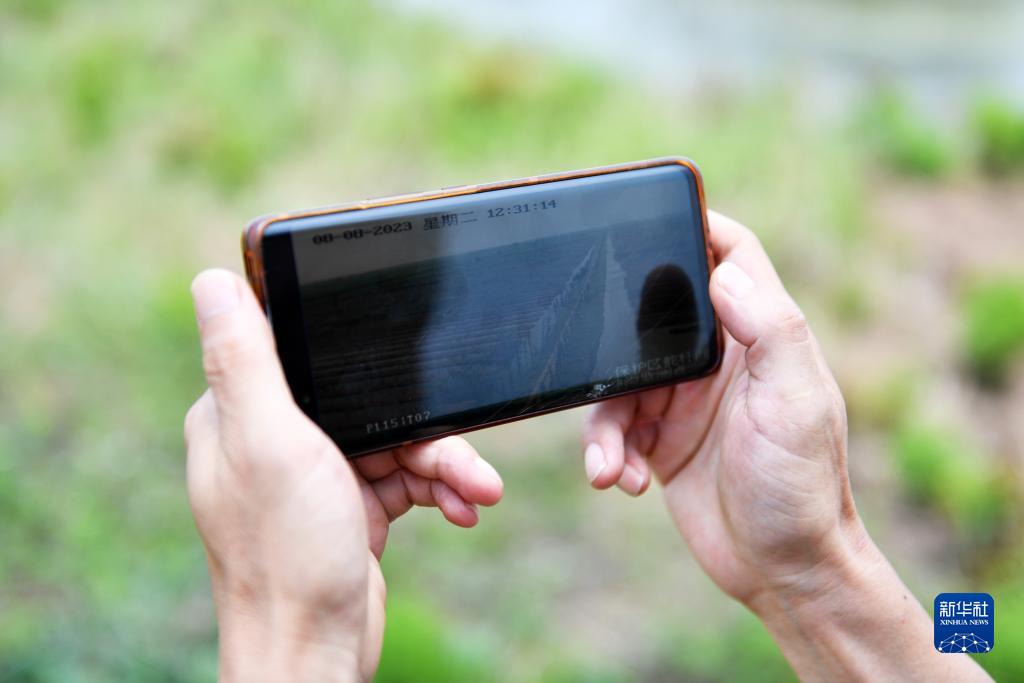 8月8日,陈新在洞庭湖舵杆洲通过手机查看实时监测画面。新华社记者 陈振海 摄