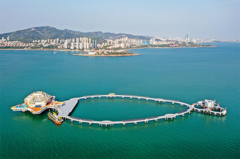 迎着夏日海风,记者乘船登上这块深海“宝石”。这是融合海洋渔业、海工装备、海洋文旅、科普教育、影视娱乐等功能于一体的“海上综合体”。河北游客陈家栋海上垂钓之后,还参观了海洋科普馆,体验深海电梯。他说:“这里的项目特色鲜明,比城里的综合体更有趣。”