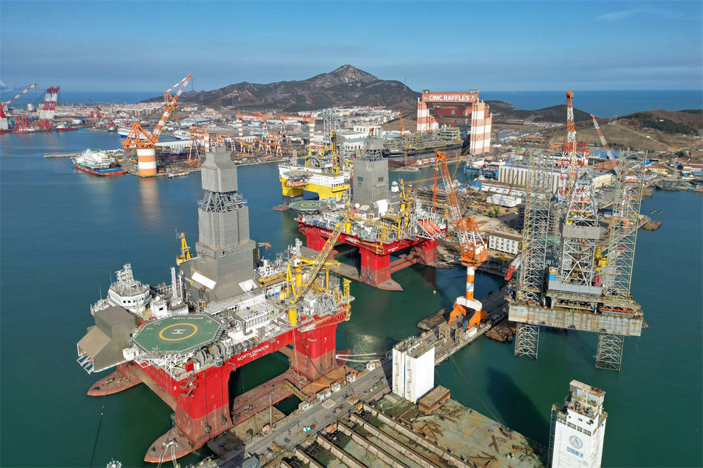 鸟瞰中集来福士山东烟台建造基地(2023年2月7日摄,无人机照片)。新华社发(唐克 摄)