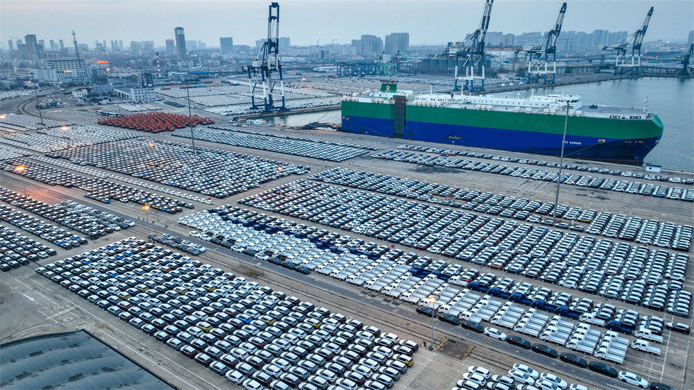 在烟台港商品车滚装码头,外贸商品车在等候发运(2023年1月18日摄,无人机照片)。新华社记者 朱峥 摄